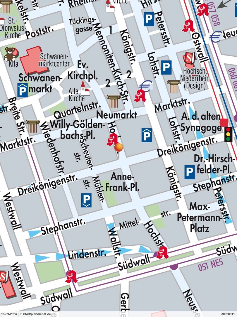 Das tolle Eckladenlokal befindet sich in der Krefelder-Fußgängerzone (Hochstraße) in der Nähe des Neumarktes. In der Nachbarschaft ist eine Vielfalt von Geschäften vertreten. Innerhalb weniger Gehminuten befinden sich die Haltestellen der öffentlichen Verkehrsmittel auf Ost- und Südwall, wo alle Krefelder Straßenbahnlinien und eine große Anzahl von Buslinien genutzt werden können. Auch der Hauptbahnhof ist nur wenige Gehminuten entfernt. Öffentliche Parkplätze für Ihre Kunden befinden sich in direkter Umgebung.