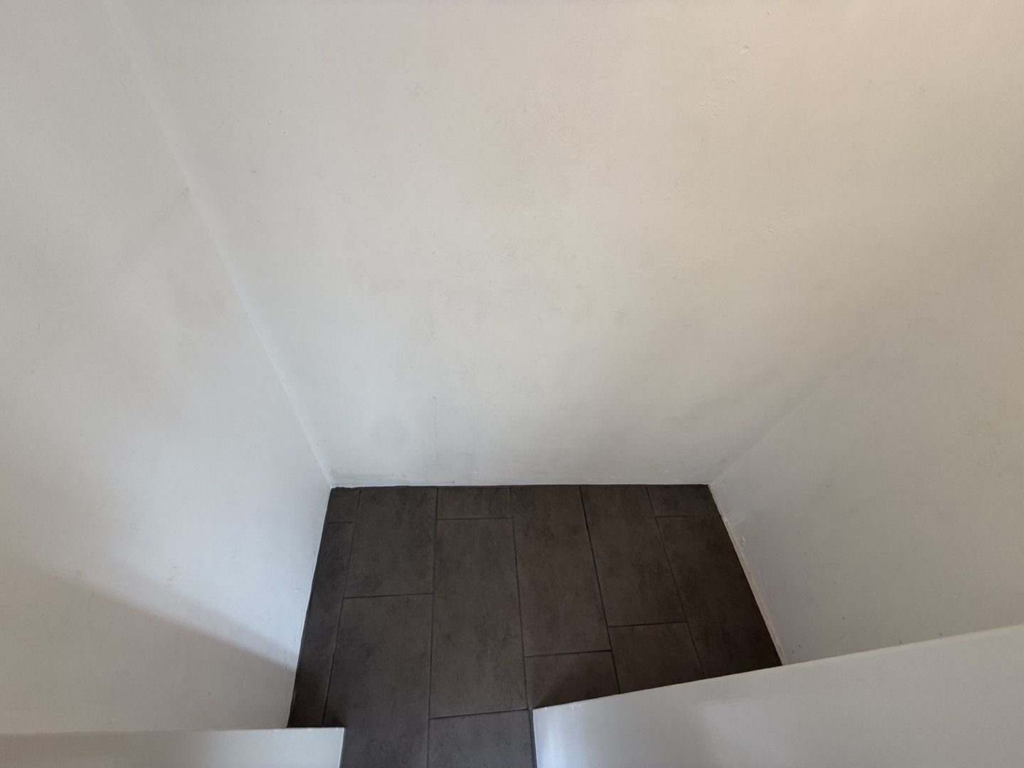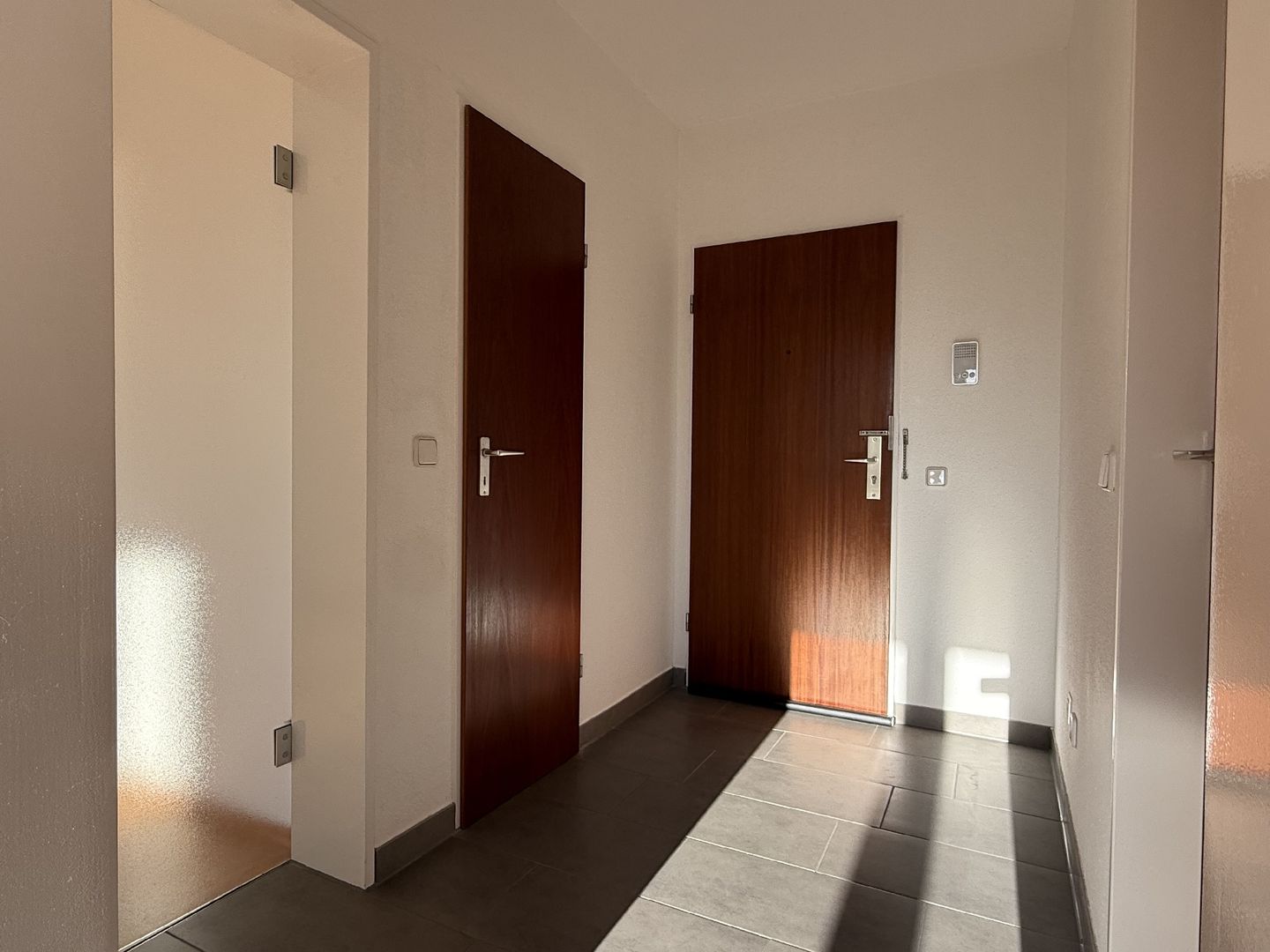 - graue Bodenfliesen in Flur, Abstellraum und Kochnische