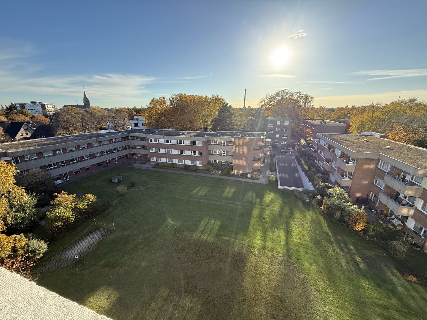 Bereits beim Betreten des Grundstücks empfängt Sie ein äußerst gepflegtes und durchdachtes Erscheinungsbild dieser Immobilie. Die neue Haustür- und Klingelanlage des ursprünglich um 1973 errichteten Gebäudes vermittelt ein modernes Wohngefühl. Saubere Mülltonnenanlagen, Abstellmöglichkeiten für Fahrräder und eine Rampe, mithilfe welcher Sie die 5 Stufen zum Haus auch barrierefrei überwinden können, bilden den ersten Eindruck. Ihre Wohnung im 5. Obergeschoss erreichen Sie sowohl über das helle und breite Treppenhaus, als auch mit dem kürzlich erneuerten Aufzug. Auf Ihrer Etage führt ein separater Flur für 4 Wohnungen Sie zu Ihrem Eingang.