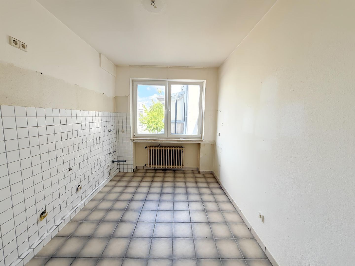 Das ruhig gelegene Schlafzimmer überzeugt durch seine angenehme Größe und eine freundliche Helligkeit. Die separate Küche mit klassischen Wandfliesen bietet genügend Platz für eine individuelle Küchengestaltung.