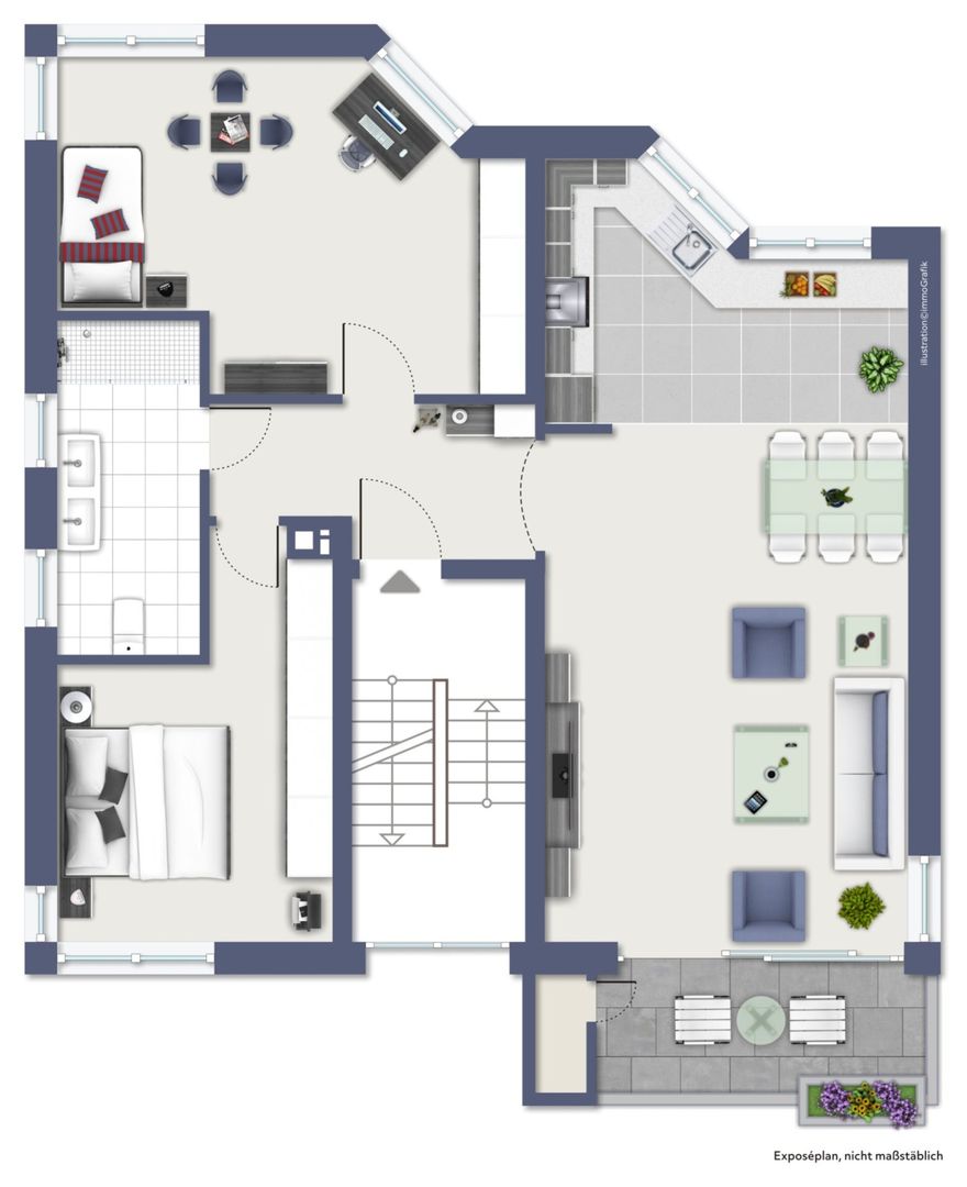 Der Grundriss überzeugt durch einen hellen Wohn- und Essbereich mit Zugang zum sonnigen Südbalkon. Dank Markise genießen Sie hier entspannte Stunden im Freien. Die separate Küche, eine großzügige Diele sowie drei weitere Zimmer bieten ausreichend Platz für z.B. Elternschlafzimmer, Kinderzimmer und ein Homeoffice oder Gästezimmer.