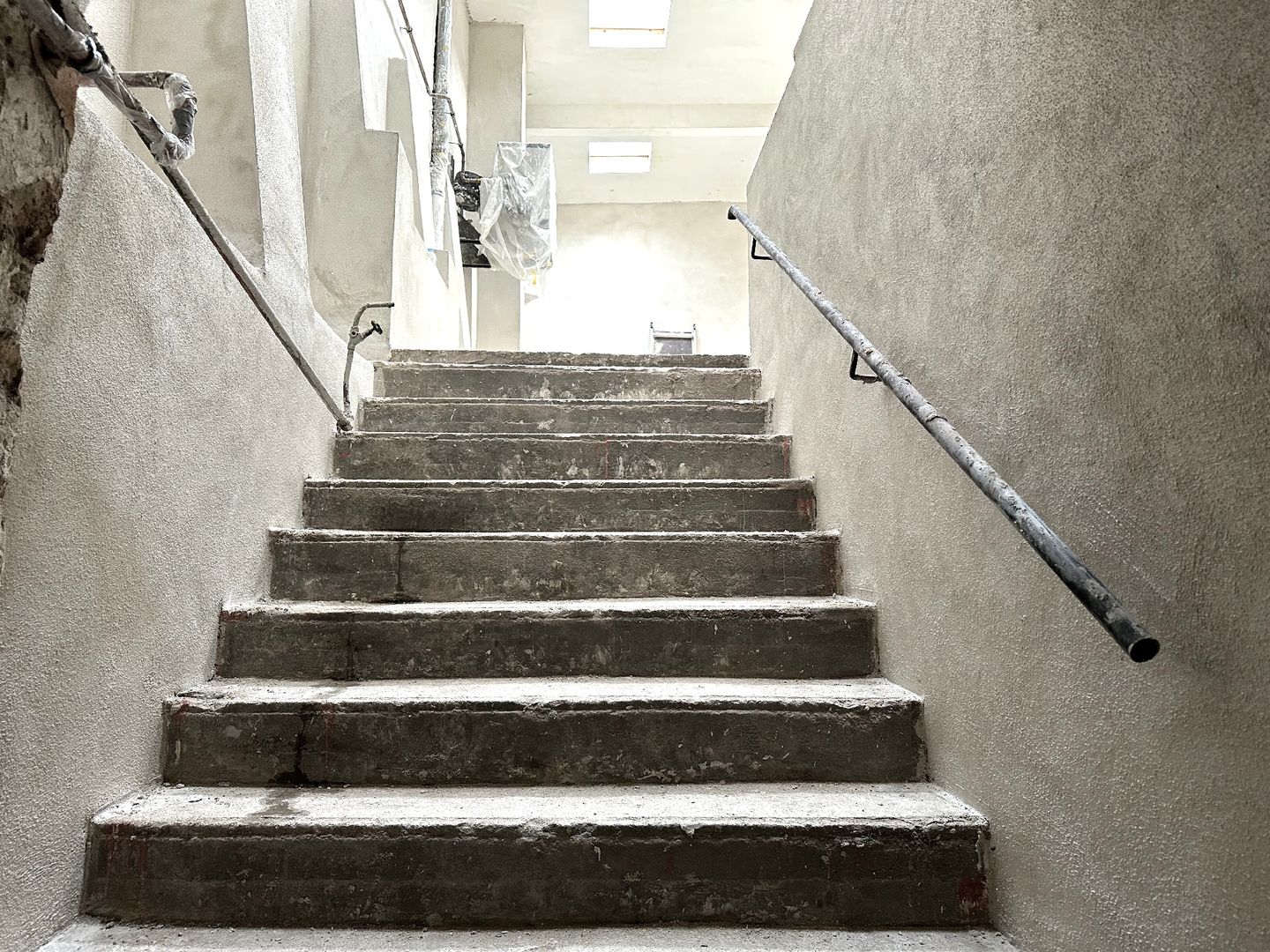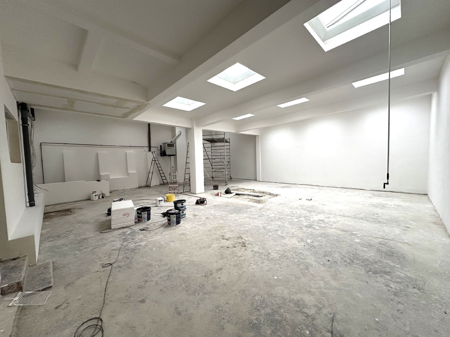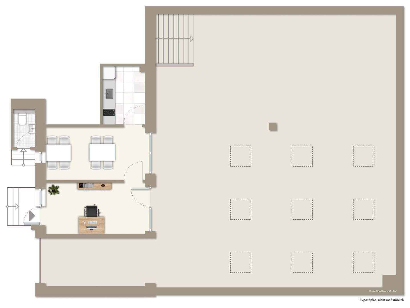 Eine breite Treppe führt von der gut über Dachfenster ausgeleuchteten Halle (ca. 154 m²) ins Untergeschoss. Hier befindet sich eine ca. 57 m² große Lagerfläche. Eine WC-Einheit (vom Hof zugänglich) gehört ebenfalls dazu.