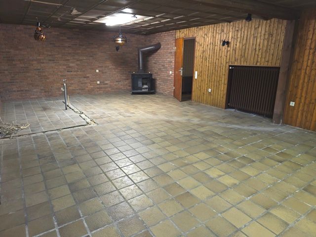 Auch das Kellergeschoss ist vollständig ausgebaut und gefliest. Neben einem Hauswirtschaftsraum gibt es ein Gäste-Schlafzimmer sowie einen Partyraum mit Kaminofen. Ein weiteres Bad mit Dusche und Waschbecken ergänzt das Angebot.