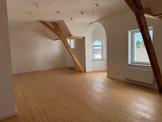 Diese außergewöhnlich großzügige und lichtdurchflutete 2-Zimmer-Dachgeschosswohnung mit ca. 120 m² Wohnfläche bietet exklusives Wohnen auf hohem Niveau. Die Wohnung befindet sich im obersten Geschoss eines gepflegten Mehrfamilienhauses und vereint offene Raumgestaltung mit modernem Wohnkomfort. Der weitläufige Wohn- und Essbereich beeindruckt durch seine offene Architektur, große Fensterflächen und die angenehme Raumhöhe mit Sichtbalken, die dem Raum eine besondere Atmosphäre verleihen. Die Wohnung verfügt über ein geräumiges Schlafzimmer mit viel Platz für Schrank- und Stauraummöglichkeiten. Die moderne Küche ist offen zum Wohnbereich gestaltet und kann nach individuellen Vorstellungen eingerichtet werden. Das stilvoll geflieste Badezimmer ist mit einer Badewanne sowie einer separaten Dusche ausgestattet und bietet ebenfalls Tageslicht.