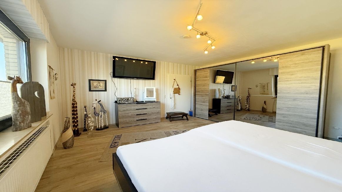 Eine derzeit verschlossene Verbindungstür zwischen dem Schlafzimmer der Hauptwohnung und der Diele der Einliegerwohnung kann mit wenig Aufwand wieder geöffnet werden, sodass die Einheiten im ganzen nutzbar sind.