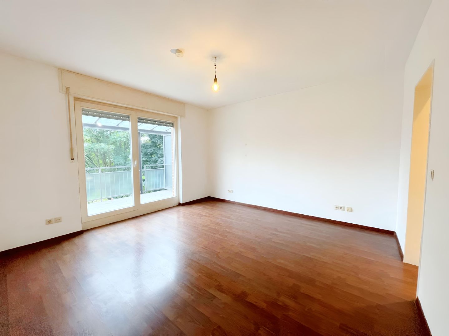 Der zentrale Dielenbereich verbindet alle Räume und bietet dank Einbauschränken praktischen Stauraum. Das lichtdurchflutete Wohnzimmer sowie die separate Küche ebenfalls mit Zugang zum Balkon schaffen ein angenehmes Wohngefühl. Der außergewöhnlich breite, teilweise überdachte Balkon lädt zu entspannten Stunden im Freien ein.