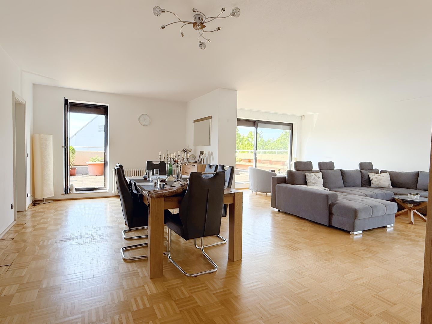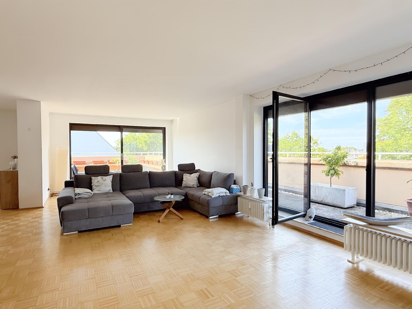 Das Highlight dieser Wohnung sind definitiv die große Dachterrasse und der zweiseitig umlaufende Balkon. Beide sind von nahezu allen Räumen über bodentiefe Fenster, welche zudem für einen tollen Tageslichteinfall sorgen, begehbar.
