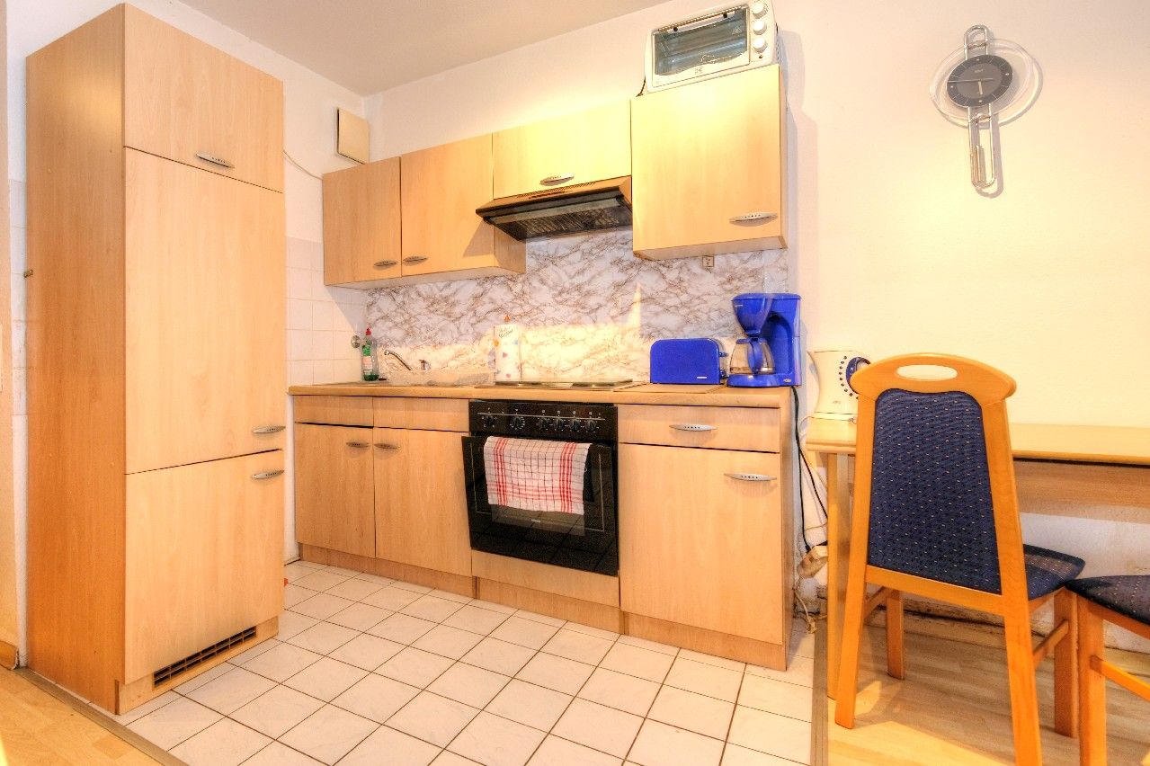 Eine integrierte Einbauküchenzeile, eine komplette Möblierung, ein helles Bad mit Dusche, ein Abstellkeller, gepflegte Gemeinschaftsanlagen, ein eigener Stellplatz in der Tiefgarage sowie ein großer öffentlicher Parkplatz vor dem Haus runden das interessante Angebot ab.