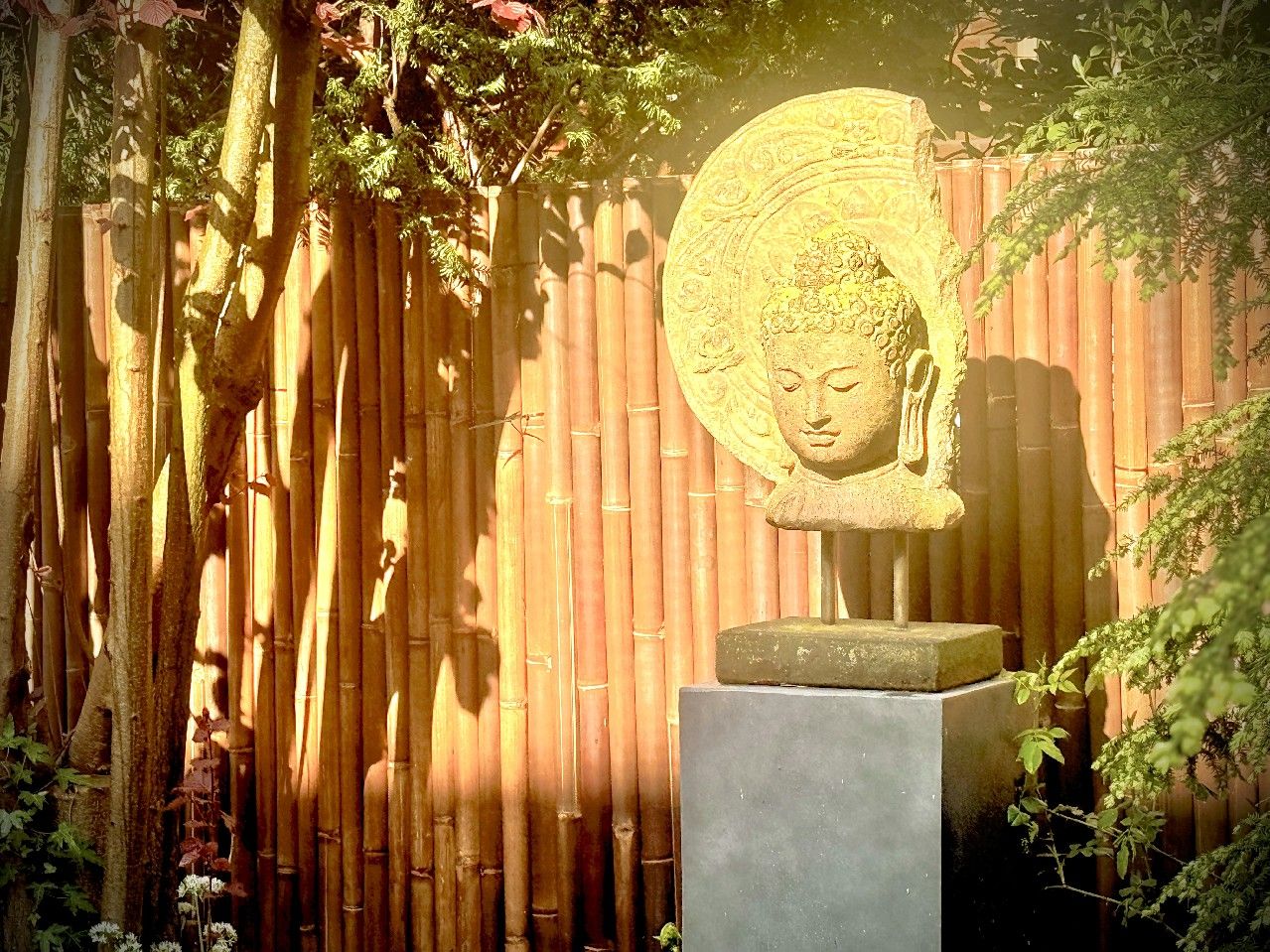 schön gestaltete, asiatische und sehr sonnige Gartenoase mit großer Terrasse, Grillplatz uvm.