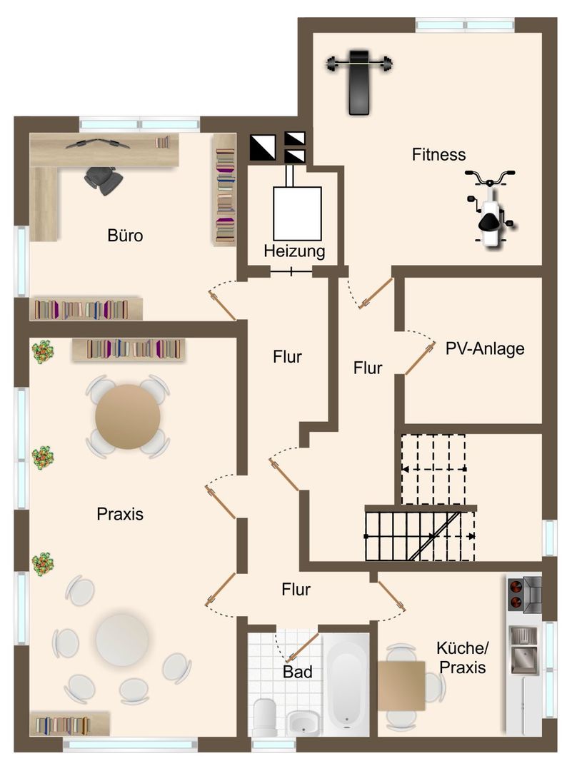 Praxisbereich o.ä. mit Küche und Bad im Untergeschoss in Wohnraumstandard ausgebaut